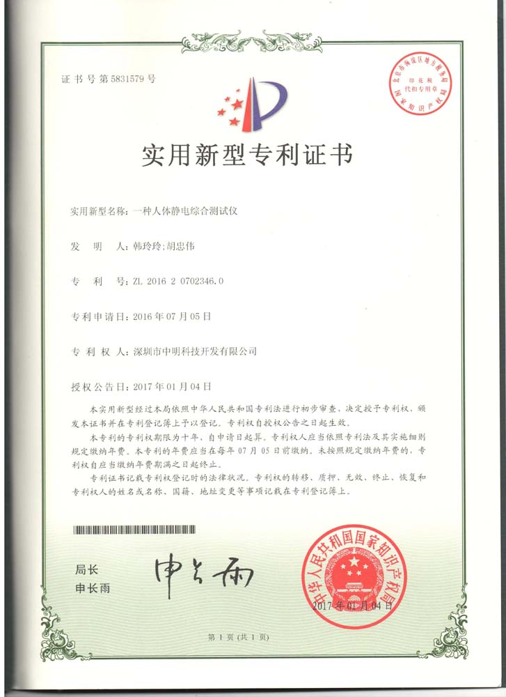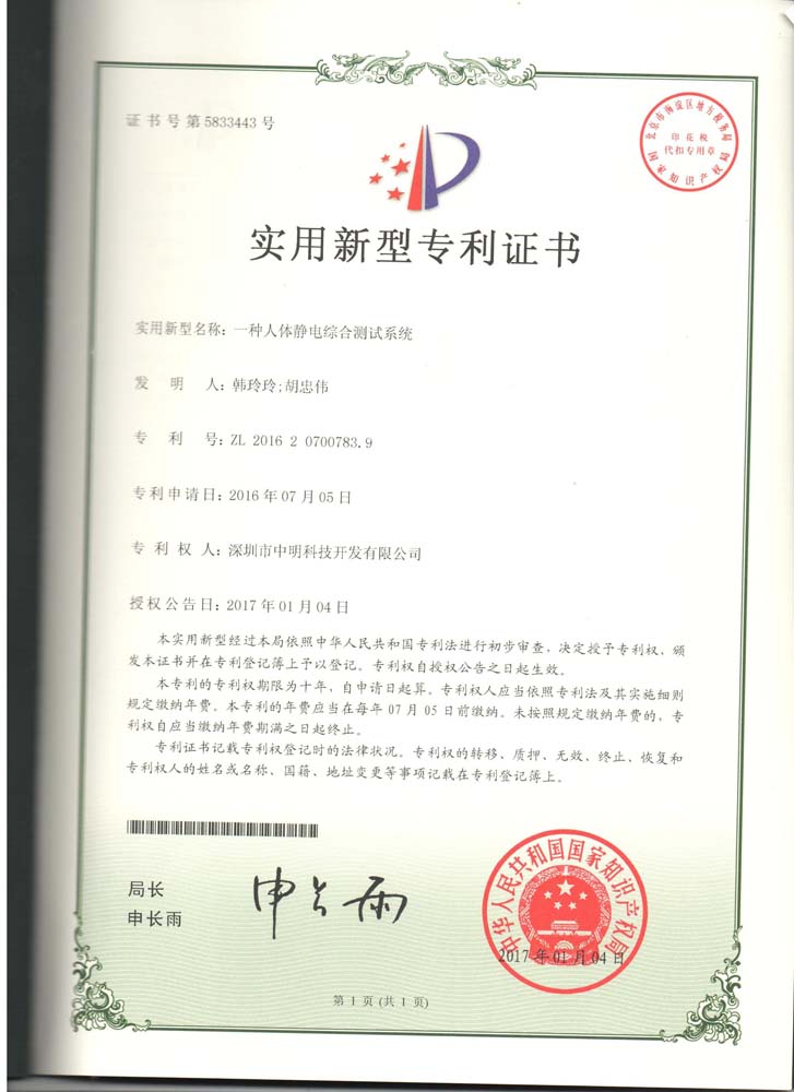 經(jīng)過全體同仁的共同努力,公司自主研發(fā)的人體綜合測試儀、防靜電用品監(jiān)測設備及系統(tǒng)、網(wǎng)絡型地線監(jiān)測儀、防靜電隔離裝置、防靜電用品測溫裝置及系統(tǒng)分別獲得了國家知識產(chǎn)權書明頒發(fā)的“實用新型專利證書”。
