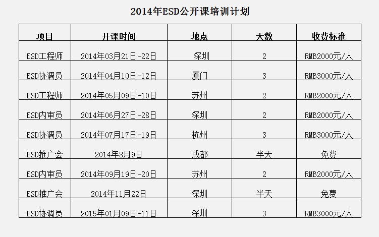 為迎合各企業(yè)2014年ESD培訓(xùn)需求,博瑞思制定了相關(guān)的ESD公開課培訓(xùn)計劃,敬請各位查閱!歡迎各位踴躍報各!再此感謝以往支持、正在支持及后續(xù)支持博瑞思的客戶!也祝各企業(yè)2014年生意興隆,財源廣進!