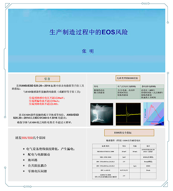 張明老師針對在電子工廠EOS的風(fēng)險(xiǎn)并結(jié)合實(shí)際的案例分析講解了一般工廠使用的電烙鐵EOS問題,在ANSI/ESD S20.20:2014版標(biāo)準(zhǔn)中也有對應(yīng)的測量標(biāo)準(zhǔn),但是電烙鐵若出現(xiàn)接地不良,電源線在移動(dòng)過程中,電烙鐵對地阻值出現(xiàn)異常,同時(shí)在案例分析中烙鐵被測試出電壓為99V,電流在10uA,那就足以導(dǎo)致芯片(指課件案例中的芯片型號)直接損壞。